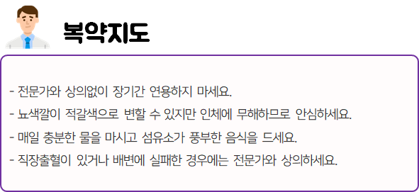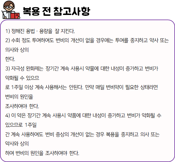 이 의약품은 장점막을 자극하며, 변에 수분을 축적시켜 부드럽게 함으로써 변의 배출을 도와주는 약이니 참고하시길 바랍니다.