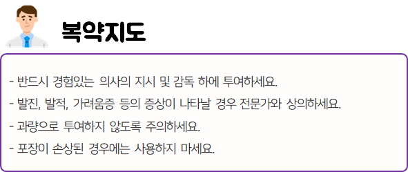 몸에 맞지 않는 의약품의 경우 크고 작은 이상 반응을 불러일으킬 수 있으므로 투여 전에 반드시 부작용이나 주의사항 등을 미리 확인하시길 바랍니다.
