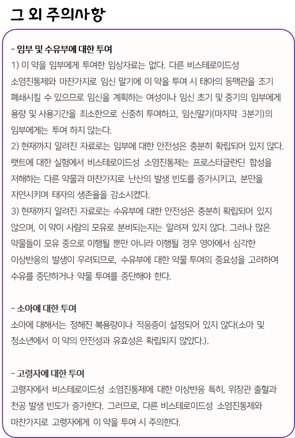 또한 이 약을 복용할 때 심혈관계 부작용을 최소화하기 위해 최저 유효 용량으로 최단 기간 동안 복용하시길 바랍니다.