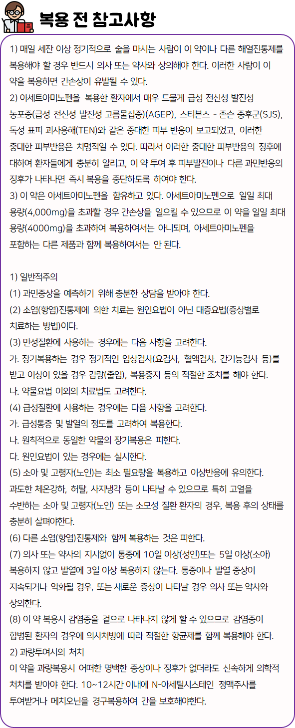 이 의약품은 체온조절중추에 작용하여 열을 내리고, 통증을 해소하는 약이니 참고하시길 바랍니다.