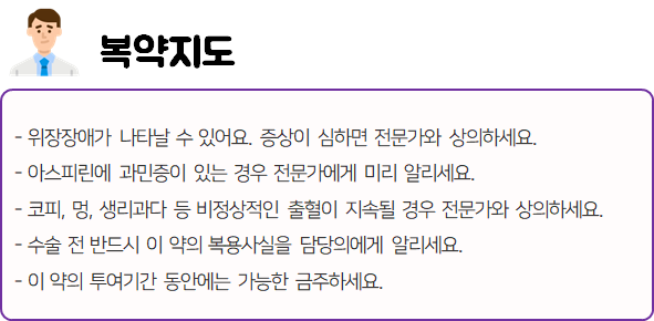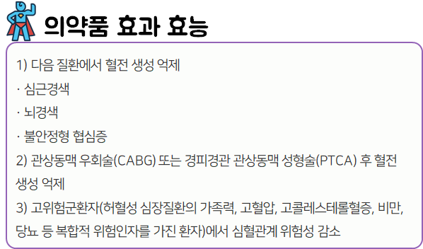 이 의약품은 혈소판 응집을 억제하여 혈전 생성을 방지함으로써 심혈관계 질환을 예방하는 약이니 참고하시길 바랍니다.