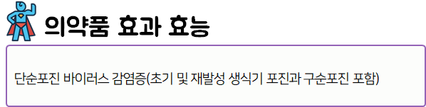 이 의약품은 '바이러스의 증식을 억제하여 바이러스에 의한 각종 감염증을 치료하는 약'이니 참고하시길 바랍니다.