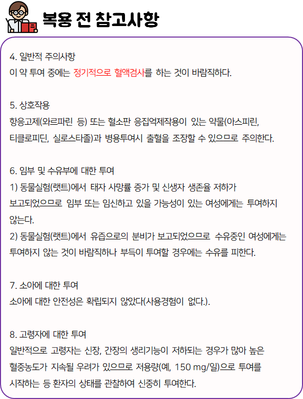 이 의약품은 혈소판 응집을 억제하고, 혈관 확장작용을 나타내는 약이니 참고하시길 바랍니다.