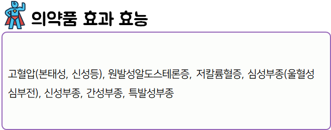 이 의약품은 칼륨의 배설은 감소시키고 나트륨 및 수분의 배설은 증가시켜 고혈압 및 부종을 치료하는 약이니 참고하시길 바랍니다.
