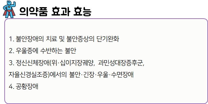 이 의약품은 진정 및 안정 효과를 나타냄으로써 각종 불안장애를 개선하는 약이니 참고하시기 바랍니다.