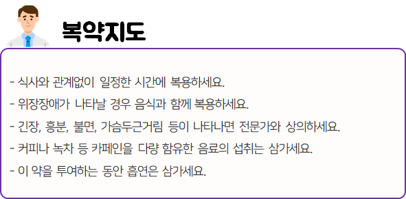이 의약품은 기관지 평활근을 이완시켜 확장작용을 나타냄으로써 기도폐쇄성 장애에 의한 호흡곤란 증상을 완화시키는 약이니 참고하시길 바랍니다.