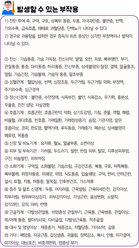 또한 복용 중 부작용 등의 이상반응이 나타날 시 즉시 복용을 멈추고, 전문가 or 의사와 상담하신 후 복용량을 줄이거나 복용을 멈추시는 것이 좋습니다.