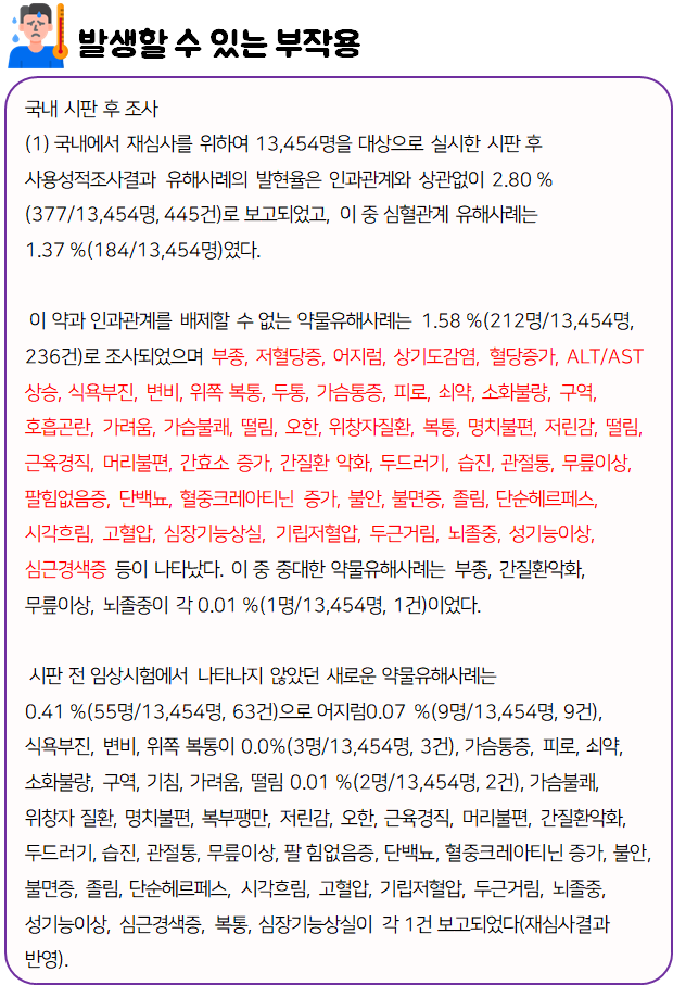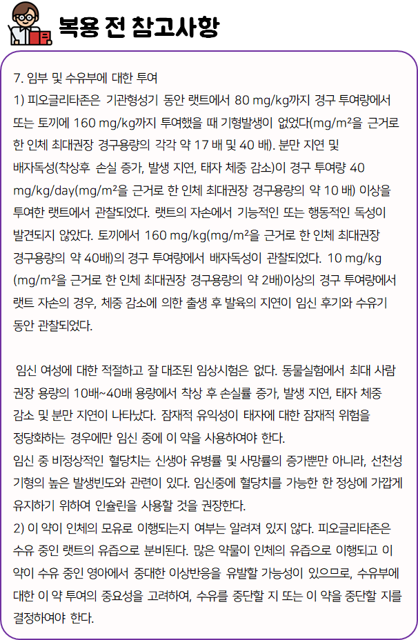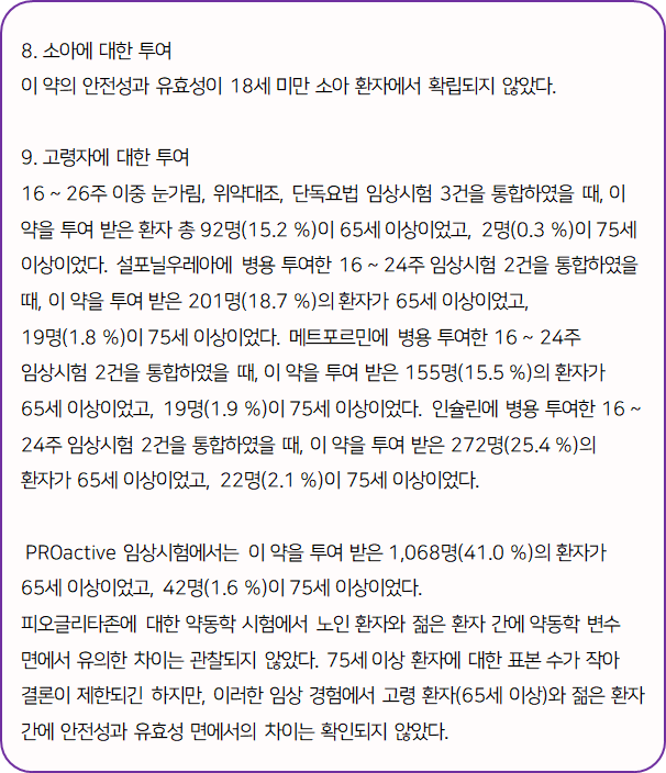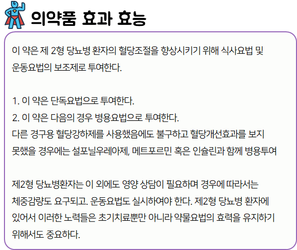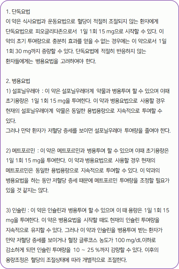 이 의약품은 인슐린 민감도를 증가시켜 당의 사용을 증가시킴으로써 혈당을 감소시키는약이니 참고하시길 바랍니다.