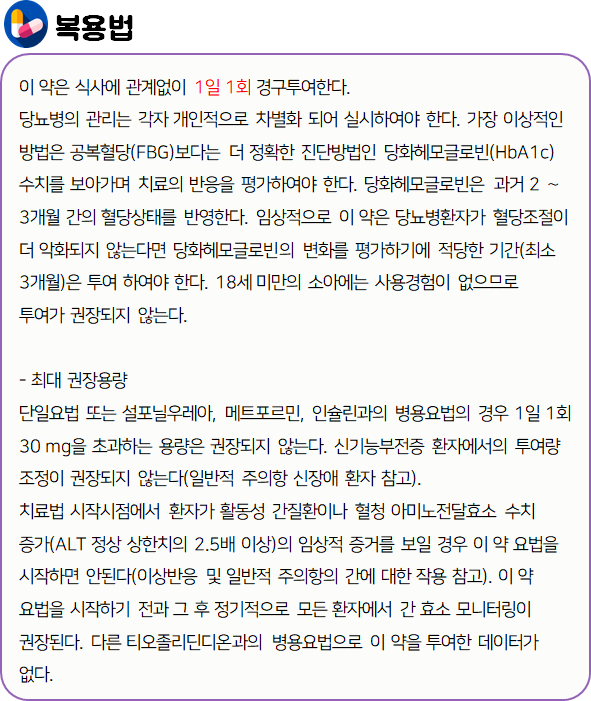 이 의약품은 인슐린 민감도를 증가시켜 당의 사용을 증가시킴으로써 혈당을 감소시키는약이니 참고하시길 바랍니다.