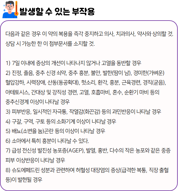 또한 혹시나 복용 중 부작용 등의 이상반응이 나타날 시 즉시 복용을 멈추고, 전문가 or 의사와 상담하신 후에 복용 지속 여부를 결정하시는 것이 좋습니다.