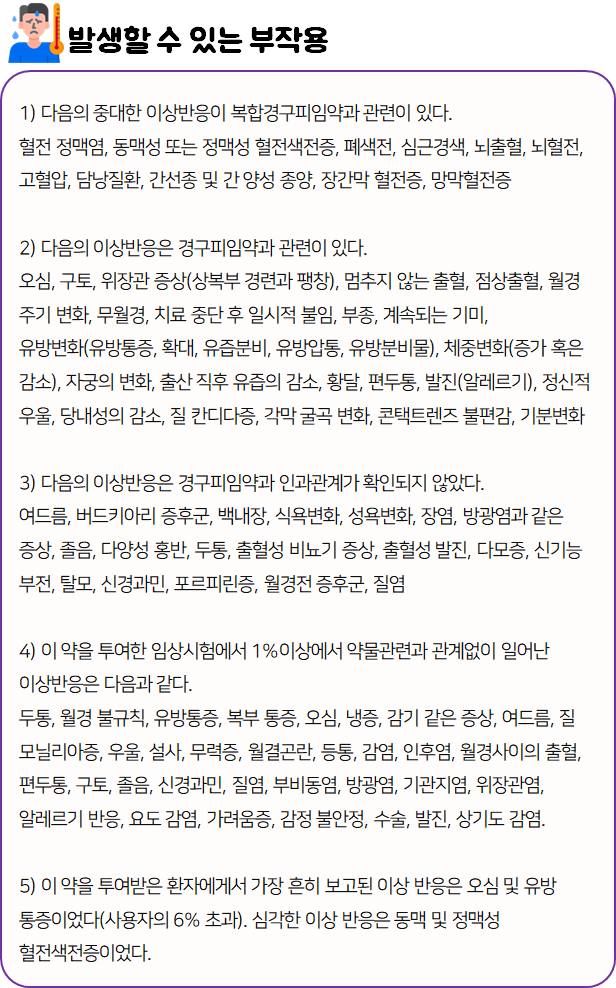 이 의약품은 배란을 억제하고, 자궁 경부를 변화시켜 정자의 침입을 막음으로써 피임 효과를 나타내는 약이니 참고하시길 바랍니다.