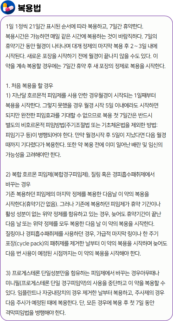 이 의약품은 배란을 억제하고, 자궁 경부를 변화시켜 정자의 침입을 막음으로써 피임 효과를 나타내는 약이니 참고하시길 바랍니다.