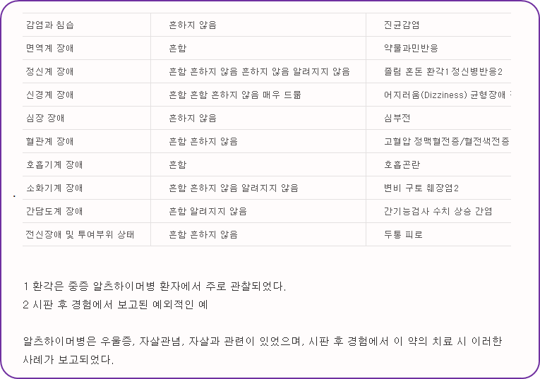 이 의약품은 '학습 및 기억 능력 등과 관련된 생리활성을 유지시켜 알츠하이머병 치료 효과를 나타내는 약'이니 참고하시길 바랍니다.