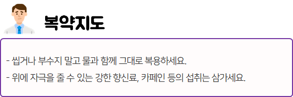 또한 복용 중 부작용 등의 이상반응이 나타날 시 즉시 복용을 멈추고, 전문가 or 의사와 상담하신 후에 복용 지속 여부를 결정하시는 것이 좋습니다.