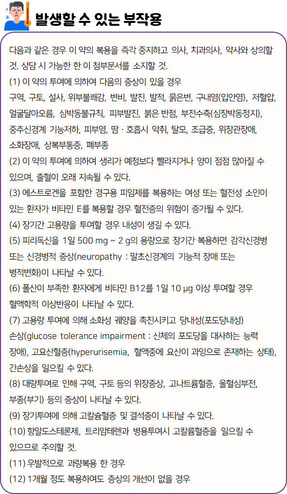 몸에 맞지 않는 의약품의 경우 크고 작은 이상 반응을 불러일으킬 수 있으므로 드시기 전에 반드시 부작용이나 주의사항 등을 미리 확인하시길 바랍니다.