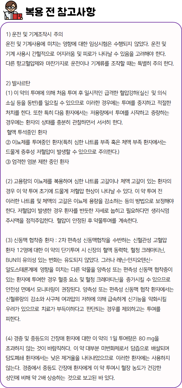 이 의약품은 혈관확장 작용으로 혈압을 낮추고, 심장 부담을 감소시키며 심장으로의 산소공급을 늘려 주는 약이니 참고하시길 바랍니다.