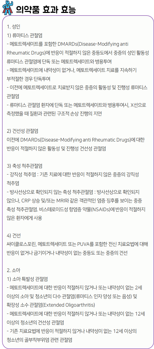 이 의약품은 과도한 염증 및 세포손상을 억제함으로써 건선 또는 관절염을 치료하는 약이니 참고하시길 바랍니다.