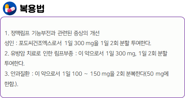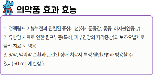 이 의약품은 "혈관벽을 보호하고 혈관저항성을 증가시킴으로써 정맥순환장애를 치료하는 약"이니 참고하시길 바랍니다.