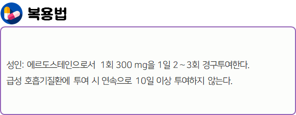 이 의약품은 점액용해 작용을 나타냄으로써 호흡기질환에서의 객담배출 곤란증상을 개선하는 약이니 참고하시길 바랍니다.