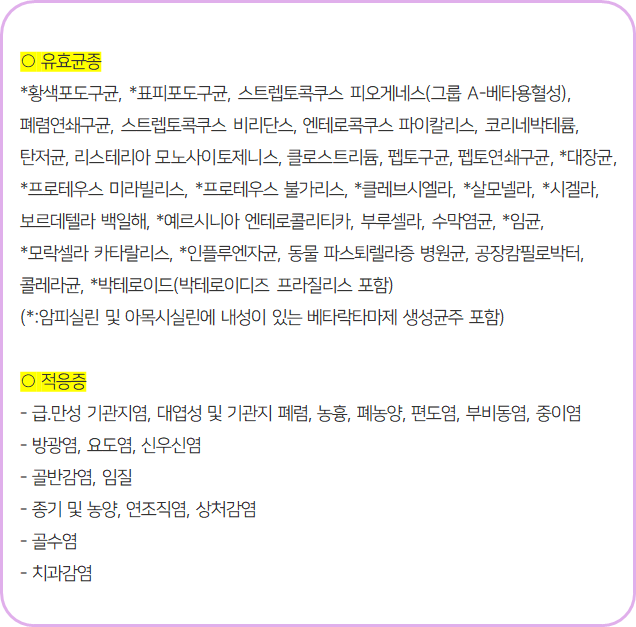 이 의약품은 항균작용을 나타냄으로써 세균에 의한 각종 감염증을 치료하는 약이니 참고하시길 바랍니다.