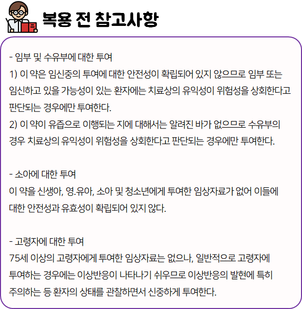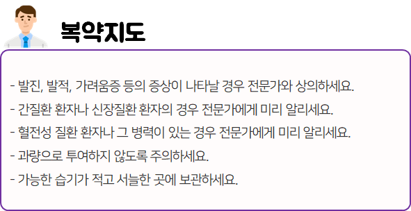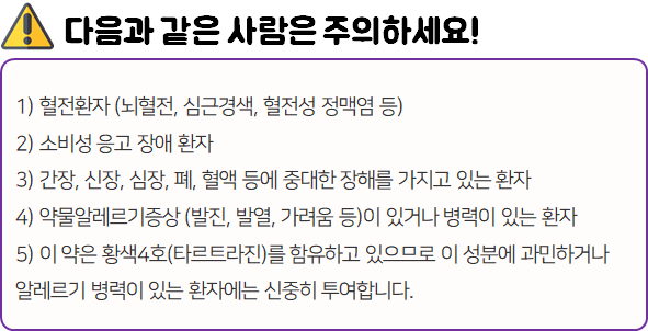 몸에 맞지 않는 의약품의 경우 크고 작은 이상 반응을 불러일으킬 수 있으므로 드시기 전에 반드시 부작용이나 주의사항 등을 미리 확인하시길 바랍니다.