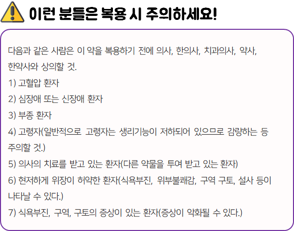 - 다음 환자는 복용 전 전문가 or 의사와 상담 후 복용하시길 바랍니다.