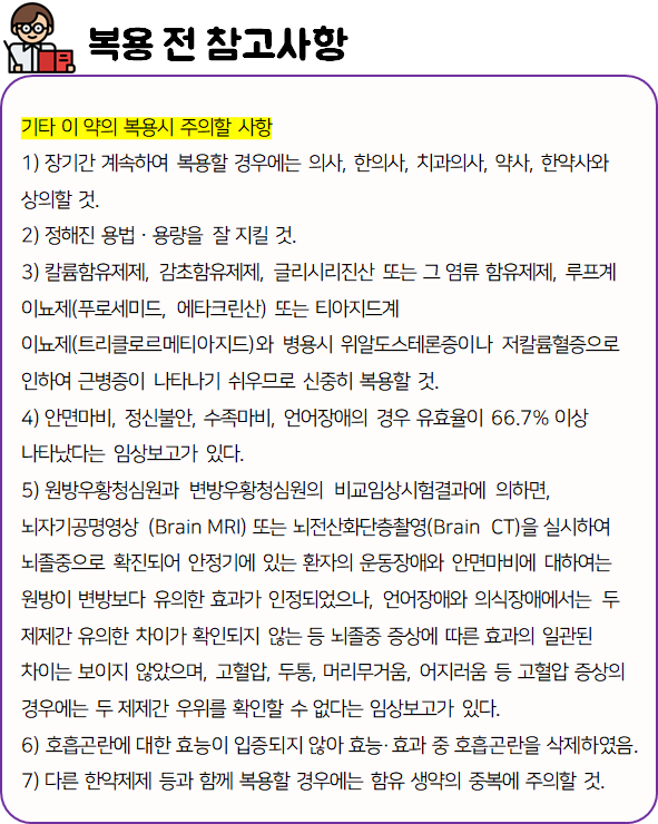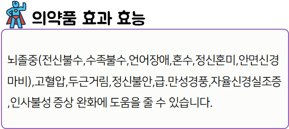 이 의약품은 '뇌 질환, 중풍성 질환, 심장성 질환, 신경성 질환 증상을 완화하는데 도움을 줄 수 있는 약'이니 참고하시길 바랍니다.