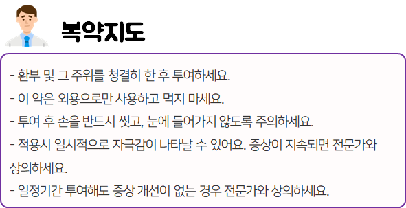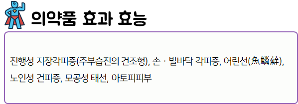 이 의약품은 '각질용해 및 피부보습작용을 하여 각종 각피증 및 건피증에 사용하는 약'이니 참고하시길 바랍니다.