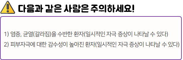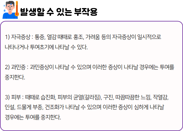 혹시라도 사용 중 부작용이나 각종 이상 반응이 나타나게 되면 즉시 사용을 멈추고, 전문가 혹은 의사와 상담하세요!