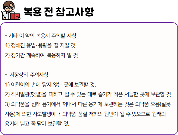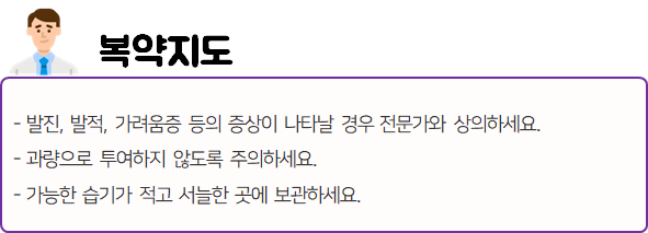 또한 복용 중 부작용 등의 이상반응이 나타날 시 즉시 복용을 멈추고, 전문가 or 의사와 상담하신 후에 복용 지속 여부를 결정 하시는 것이 좋습니다.