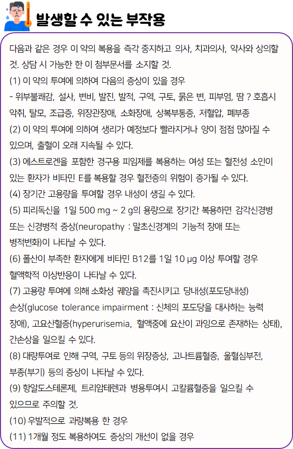 또한 복용 중 부작용 등의 이상반응이 나타날 시 즉시 복용을 멈추고, 전문가 or 의사와 상담하신 후에 복용 지속 여부를 결정 하시는 것이 좋습니다.