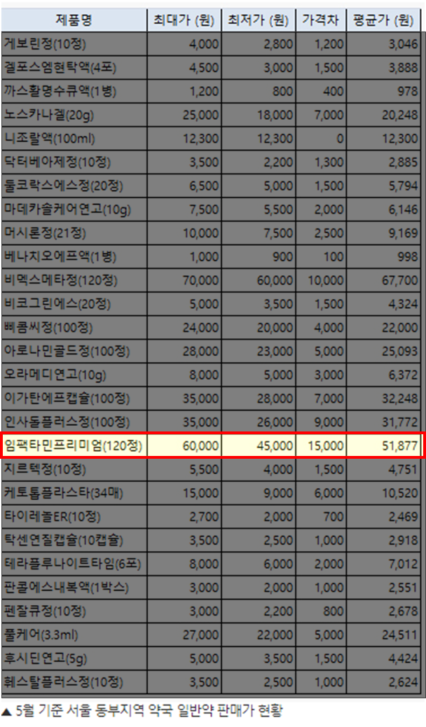 임팩타민 프리미엄은 약국에서 구매가 가능한데, 2020년 5월 기준 최대가 60,000원 최저가 45,000원으로 15,000원 정도의 차이가 있었습니다.