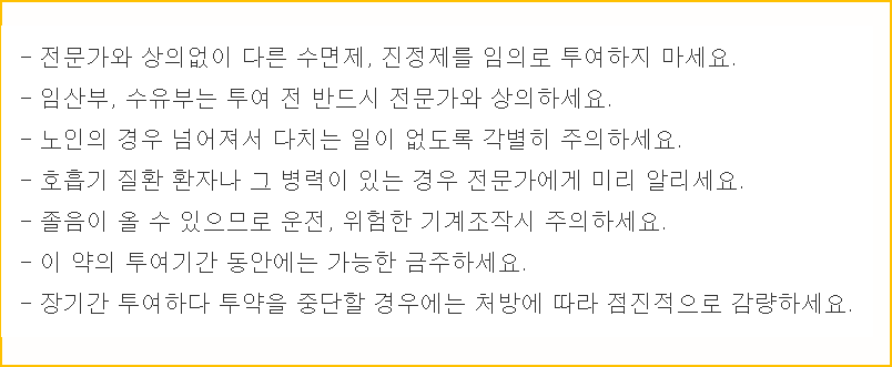 * 이 의약품을 복용하면 졸음이 올 수 있고, 반사운동능력 등의 저하가 올 수 있으므로 이 약을 복용중에는 웅운전이나 위험한 기계 조작에 조금 더 주의하시길 바랍니다.