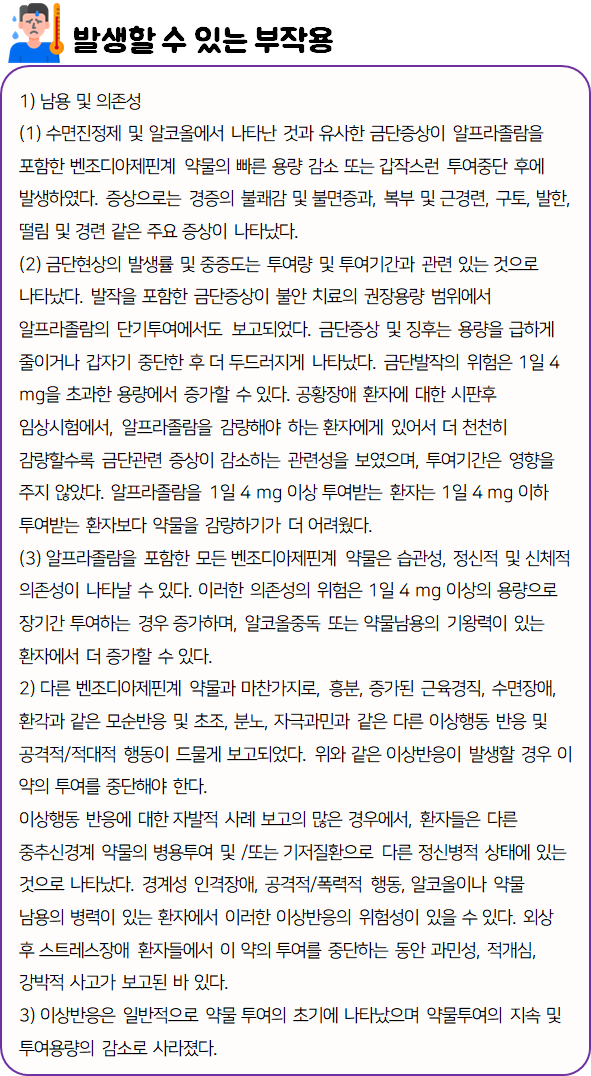 이 의약품은 "진정 및 안정 효과를 나타냄으로써 각종 불안장애를 개선하는 약"이니 참고하시길 바랍니다.