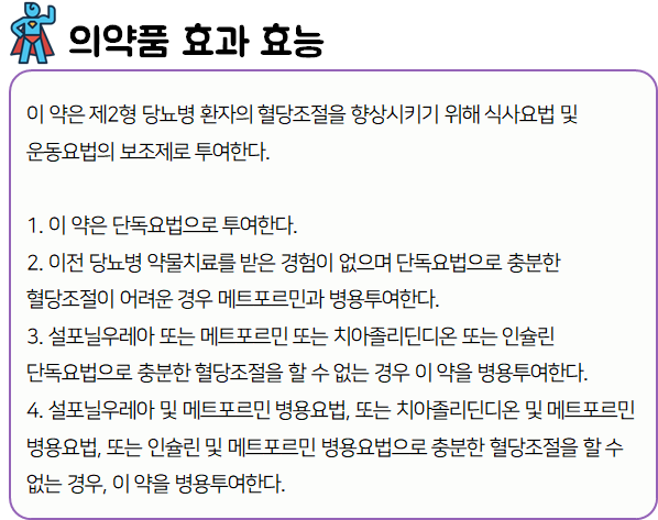 이 의약품은 ' 인슐린 방출 자극 물질의 분해를 억제하여 인슐린 분비를 촉진함으로써 혈당을 감소시키는 약'이니 참고하시길 바랍니다.