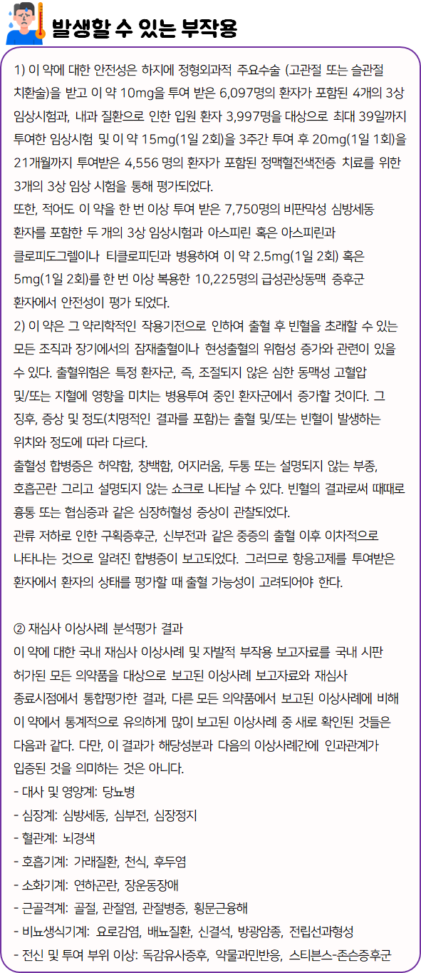 이 의약품은 '혈액응고단백질 Xa를 직접적으로 억제하여 혈전 생성을 방지하는 약'이니 참고하시길 바랍니다.