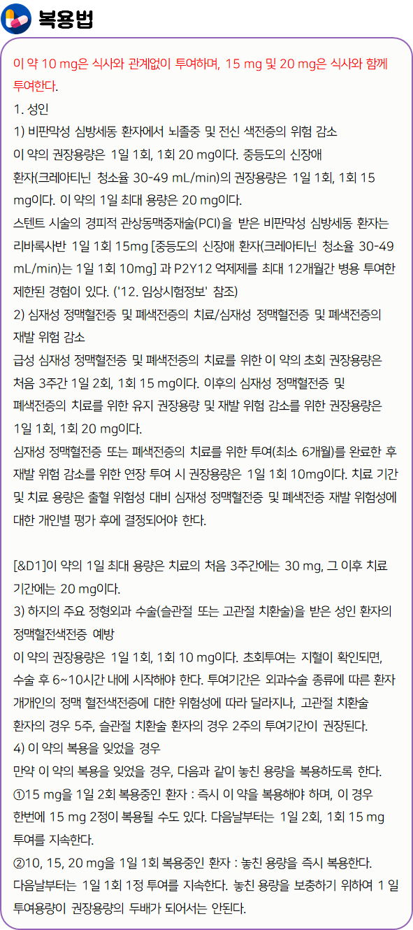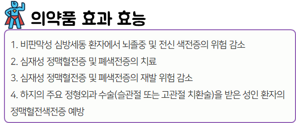 이 의약품은 '혈액응고단백질 Xa를 직접적으로 억제하여 혈전 생성을 방지하는 약'이니 참고하시길 바랍니다.