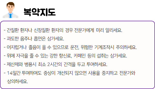 의약품은 반드시 복용 전에 복용 시 발생할 수 있는 부작용이나 주의사항 등을 미리 확인하신 후 드셔야 추후에 발생할 수 있는 부작용을 예방할 수 있습니다.