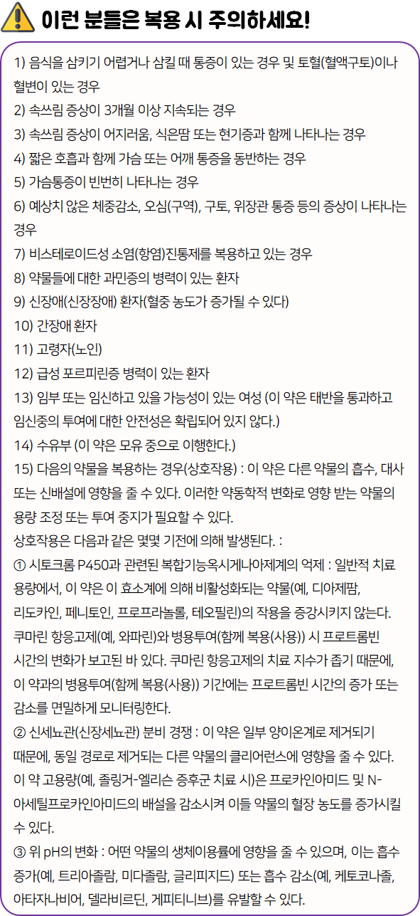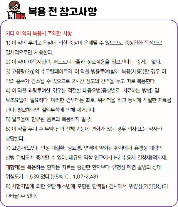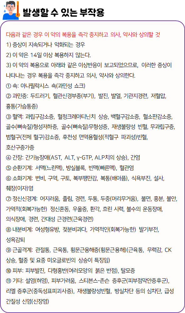의약품은 반드시 복용 전에 복용 시 발생할 수 있는 부작용이나 주의사항 등을 미리 확인하신 후 드셔야 추후에 발생할 수 있는 부작용을 예방할 수 있습니다.