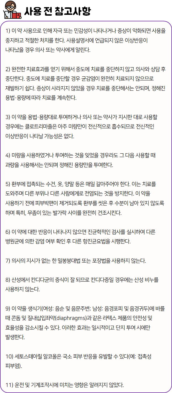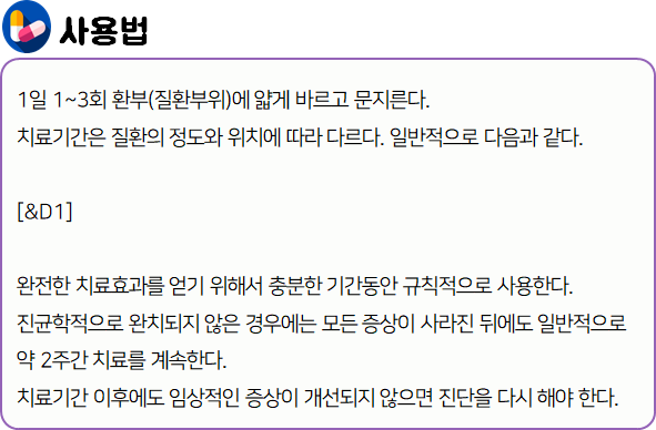 이 의약품은 '항진균 작용을 나타냄으로써 곰팡이균(진균)에 의한 피부 감염증을 치료하는 약'이니 참고하시길 바랍니다.
