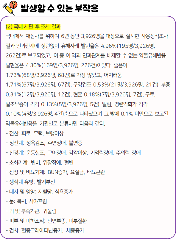 또한 복용 중 부작용 등의 이상반응이 나타날 시 즉시 복용을 멈추고, 전문가 or 의사와 상담하신 후 복용량을 줄이거나 복용을 멈추시는 것이 좋습니다.
