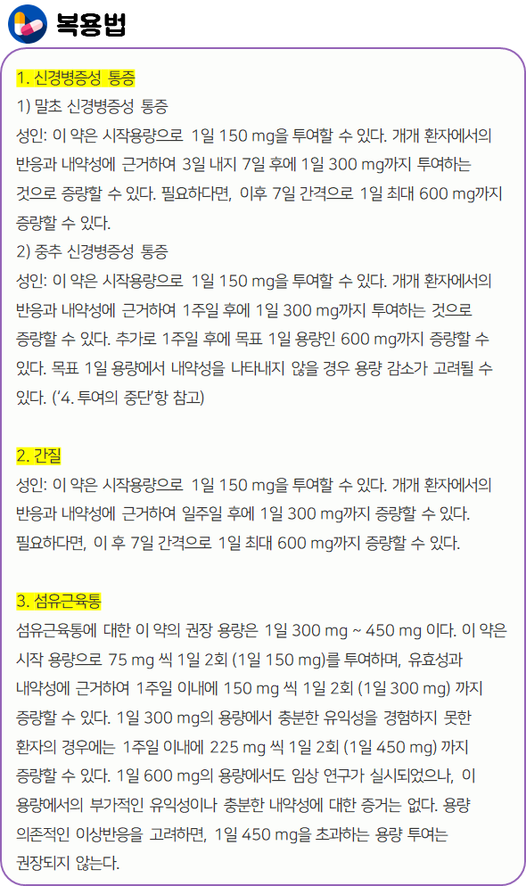 이 의약품은 과도하게 흥분한 신경막을 안정시킴으로써 경련의 빈도를 감소시키고, 신경통을 개선하는 약이니 참고하시길 바랍니다.