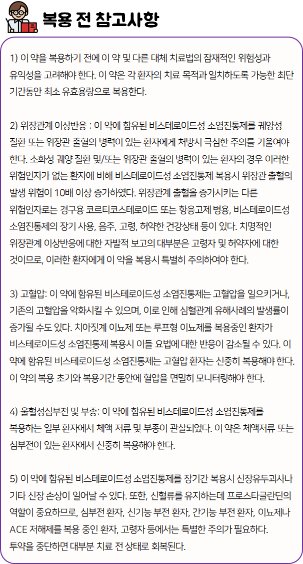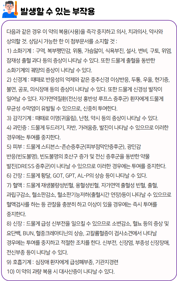 의약품은 반드시 복용 전에 복용 시 발생할 수 있는 부작용이나 주의사항 등을 미리 확인하신 후 드셔야 안전하게 먹을 수 있습니다.