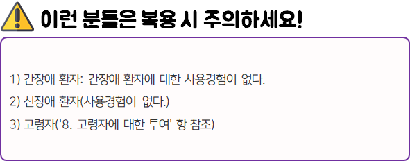 - 다음과 같은 사람은 복용 시 위험할 수 있으므로 복용하지 마시길 바랍니다.