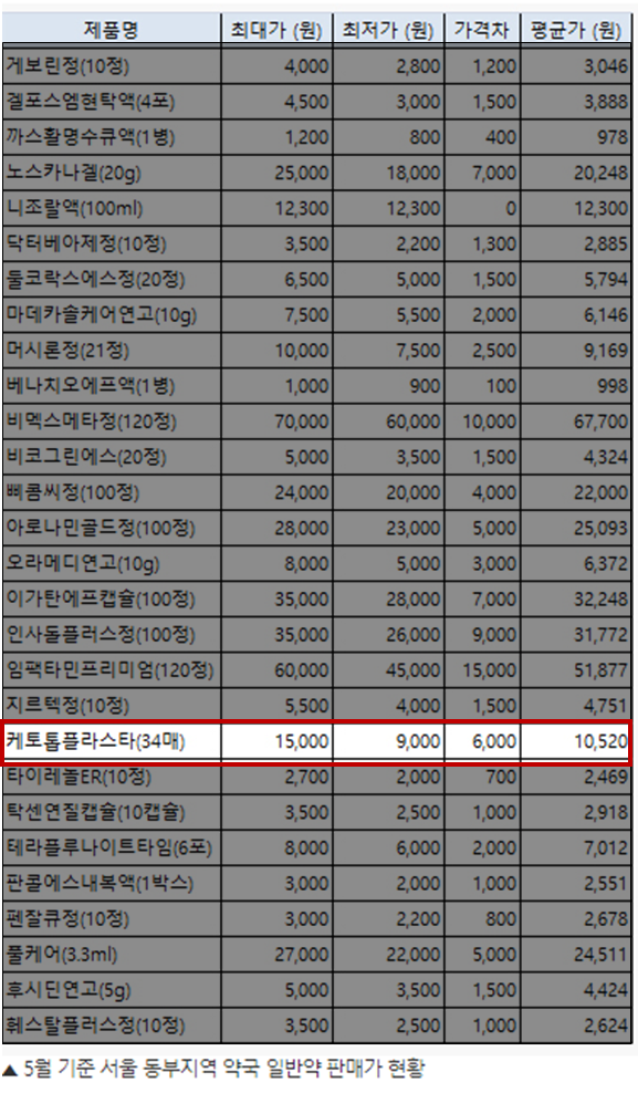 2020년 5월 기준 케토톱 34매 가격은 최대가 최저가 9,000원 부터 최대가 15,000원 까지 6,000원의 가격차를 보이고 있었습니다. (서울 동부지역 약국 기준)
