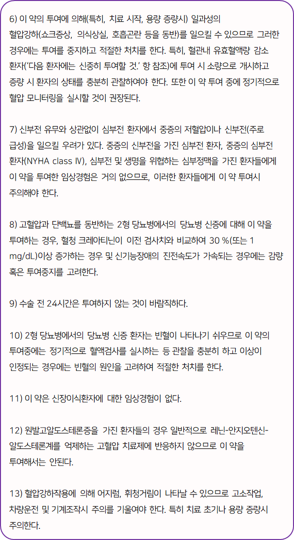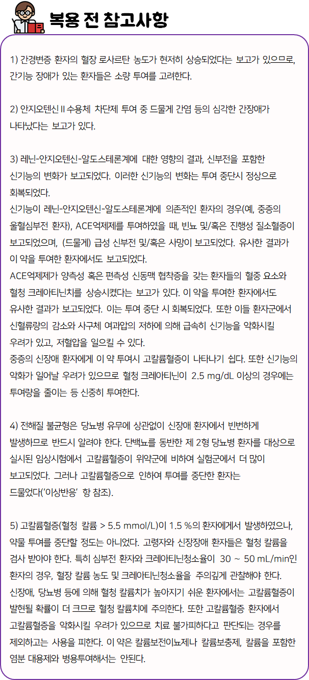 이 의약품은 단백뇨 감소작용 및 신장보호 효과가 있으며, 혈관확장작용으로 혈압을 감소시켜주는 약이니 참고하시길 바랍니다.