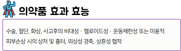 이 의약품은 '염증을 억제하고, 피부이상증식 억제효과를 나타내어 각종 흉터 치료에 사용하는 약'이니 참고하시길 바랍니다.