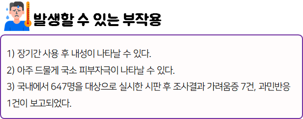 혹시라도 사용 중 부작용이나 각종 이상 반응이 나타나게 되면 즉시 사용을 멈추고, 전문가 혹은 의사와 상담하세요!