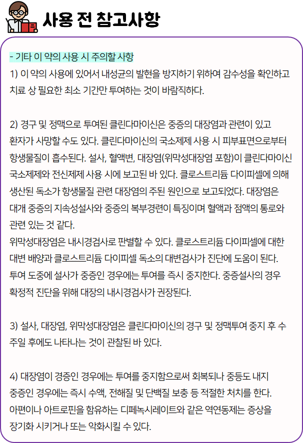 지금까지 크레오신티에 대해 자세히 알려드렸는데요, 이 의약품은 사용하시기 전에 발생할 수 있는 부작용이나 주의사항 등을 반드시 확인하신 후 사용 하시기 바랍니다.