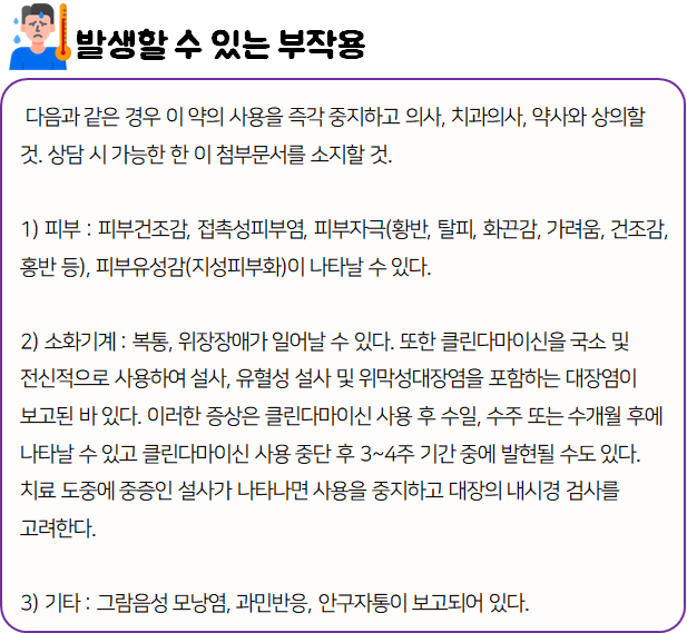 크레오신티을(를) 사용할 시 다음과 같은 부작용이 발생할 수 있으니 주의하시길 바랍니다.